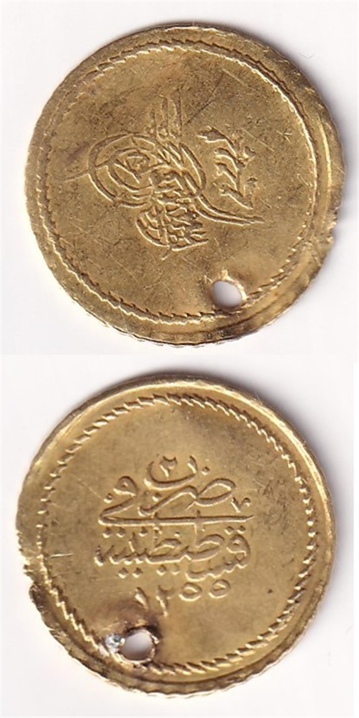 Sultan Abdülmecid, Altın, Memduhiye 10 Kuruş, 1255/2 Kulptan Çıkma (Delikli)